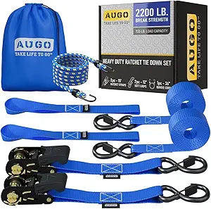AUGO Ratchet Tie Down Straps -2 PK– 15 FT – 2,200 LB Break Strength – Safety Lock S Hooks –for Moving Cargo, Appliances, Lawn Equipment, Motorcycle – Includes 1 Bungee Cord, 2 Soft Loops, Storage Bag